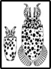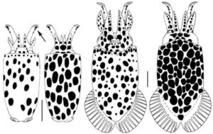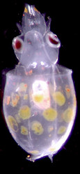 Paralarvae of two species of Chtenopteryx have been recognized in Hawaiian waters that differ in the chromatophore pattern on the distal end of the club. The more common form is illustrated below. Note that the fin ribs can just be detected in the smaller paralarva but the characteristic fins, although short, are clearly apparent in the larger paralarva. A distinctive feature of this species is the arrangement of chromatophores on the distal, aboral surface of the tentacle (arrow in illustration below).
