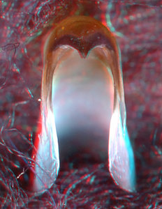 - About anaglyph 3D: Photographs here are in 3D, using anaglyph techniques which combines two photographs one in red and the other in cyan (blue + green) color. To get the 3D effect, you must use glasses with red and cyan lenses (filters) over your regular glasses. The form of the beak is far easier to interpret in 3D and we strongly recommend to the viewer that the glasses be obtained (this is especially helpful when viewing enlarged images - i.e. click on the image). These beak photographs were made using Red and Cyan Anachrome Aviator Glasses (see: http://www.anachrome.com/glassbuy.htm or http://www.amazon.com) which cost under $10.00 (USD).