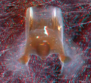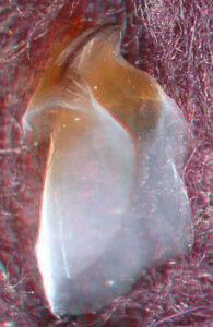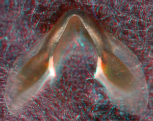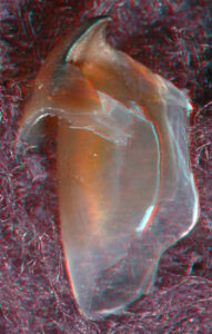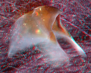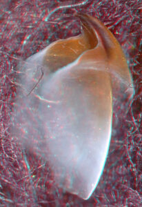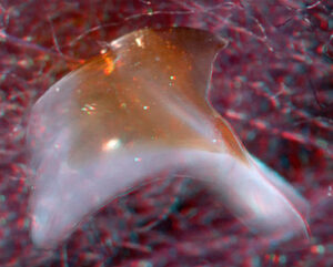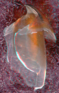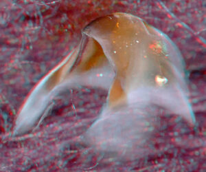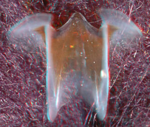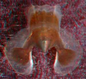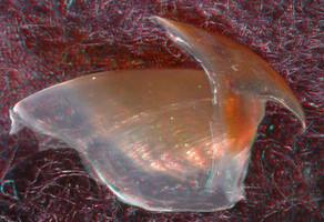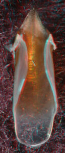 Chtenopteryx sp., mature female, 54 mm ML, 1.0 mm LRL, centralPacific. Photographs by R. Young. Chtenopteryx sp., sex ?, ? mm ML, 1.2 mm LRL, Hawaiian waters. Photographs by R. Young. Side view
