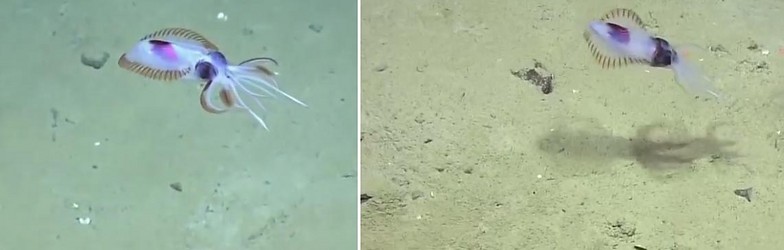 Species of Chtenopteryx are genenerally thought to be deep-living, pelagic squids some of which, at least, undergo twilight migrations to spend the night in near-surface waters (e.g. Young, 1978); data, however, are sparse. The image shows Chtenopteryx cf. sicula. swimming near the ocean floor at approximately 1300 m in the Mediterranean. Note not only the proximity to the ocean floor but the dramatic pigmentation pattern with (1) pigmentation of the fins restricted to its muscular bundles, (2) lateral pigmentation of the third arms and broad patches on arm II (?) and (3) a dark oval patch on the dorsal mantle above the digestive gland (left image). The right image was taken about 30 sec. after the first and chromatophores of the arms have been retracted.