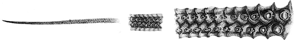 Arm II on a male D. gigas (ML 548mm) showing the morphological transition from the base of the arm (right) to mid-portion of the arm (centre) to the whip-like tip (left). (C) Pfeffer 1912
