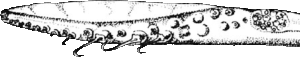 2. Long, slender hooks of ventral series have asymmetrical bases (see drawing below).