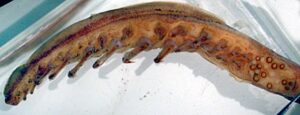 • with asymmetrical ventral tentacular hooks