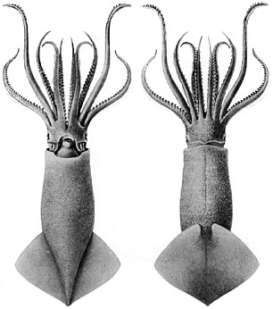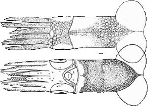 Dubinina (1980) described a juvenile squid from the Southwest Atlantic as Onykia robsoni (drawing to the right) but according to C. Nigmatullin (personal communication) it probably is a young O. ingens. The scale bar is 1 mm.