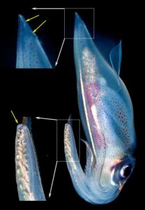 Figure. O. cf. aequimanus, in dorsal arm-curl posture, side view (in situ photograph, same squid as in title photograph). Top insert: Enlargement showing gladius rostrum (top yellow arrow) and gladius conus (bottom yellow arrow. Bottom insert: Enlargement of club showing terminal pad of right club (yellow arrow) apparently locked to aboral surface of terminal pad of left club. © 2016 Jeffrey Milisen