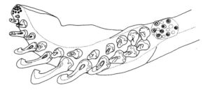 - Length ~27% ML, with 20–23 long, slender, strongly recurved hooks.