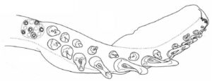 - Length ~24% ML, with 20–22 long, robust, strongly recurved hooks.
