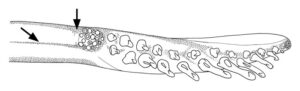 - Length ~36% ML, with 20–23 long, robust, strongly recurved hooks.