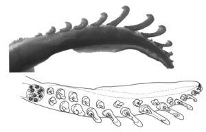 - Chromatophores present across oral face of tentacle stalk proximal to carpus and along oro-ventral tentacle stalk ridge (arrows in second image below).