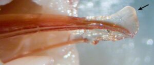 Figure. Ventrolateral view of the posterior gladius of W. jeremiahi, paratype, male, 44 mm ML showing the dorsally directed rostrum (arrow). Photograph by M. Vecchione.