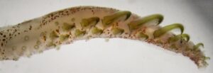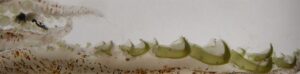 Figure. Tentacular clubs of the holotype of W. jeremiahi, male, 57 mm ML. Top - Oral view of the right club with distal tip damaged. Bottom - Ventral view of part of the left showing a near-profile view of the large hooks. Tips of two arms also visible. Photographs by M. Vecchione.