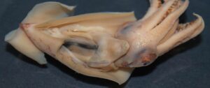 Figure. Ventral view of W. jeremiahi, paratype, male, 44 mm ML with mantle cavity exposed. Note the absence of visceral and ocular photophores. Also note the posterior termination of the mantle and fins without any trace of a "tail." Photograph by M. Vecchione ??