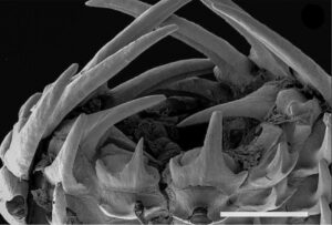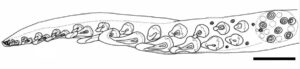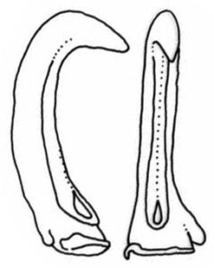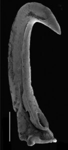 - Hooks robust, strongly curved in profile, with curved necks.Longest ventral hook (V5 or V6) ~3x length of dorsal counterpart and ~15% of club length at 105 mm ML or ~10% of club length at 35 mm ML. Ventral hook bases approximately symmetrical.