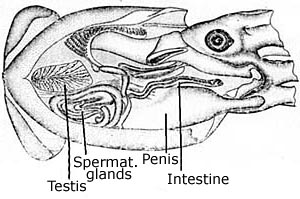 The holotype is a mature male with a large Needham's sac (36 mm long and a maximum 10 mm wide. Nesis and Nikitina (1986) describe the penis as follows: "The penis is very long, tubular, departs from the caudal end of Needham's sac and goes in the beginning perpendicularly and then parallel to it. The length and width of the parallel portion are 24 and 2 mm respectively. The ends of the penis and Needham's sac reach the mouth of the funnel."